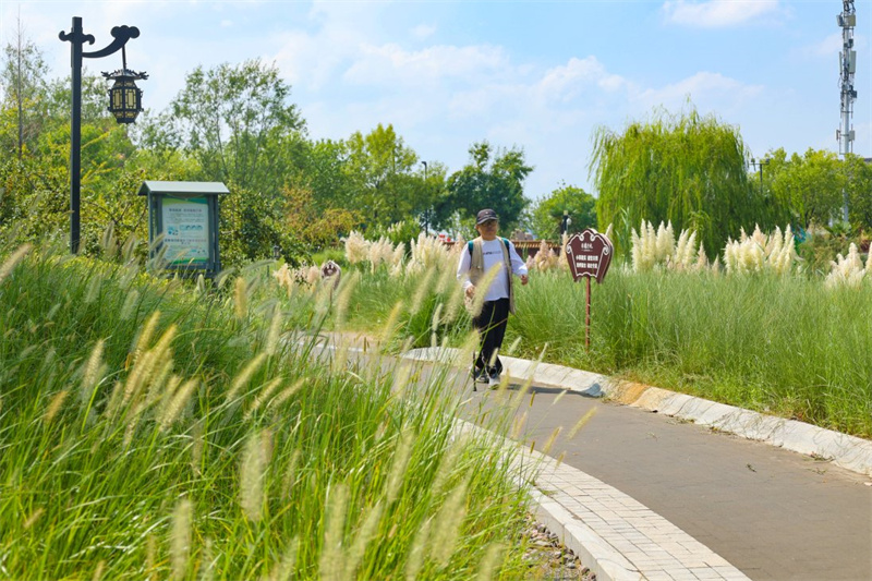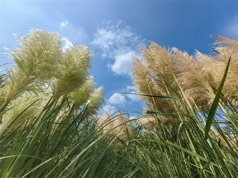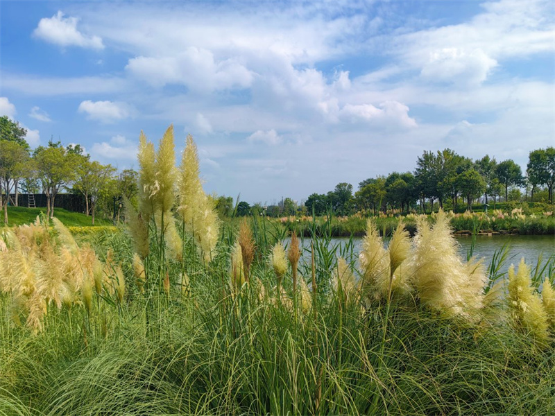 西北湖湿地公园层层叠叠的芦苇随风摇曳,与蓝天白云共同构成一幅美丽的画卷。 开封+记者石斐8月28日摄