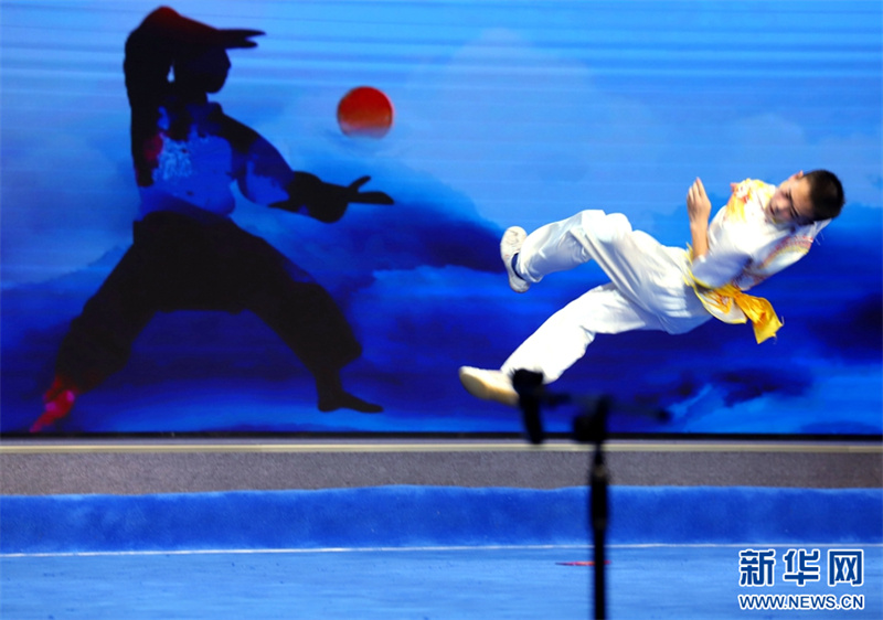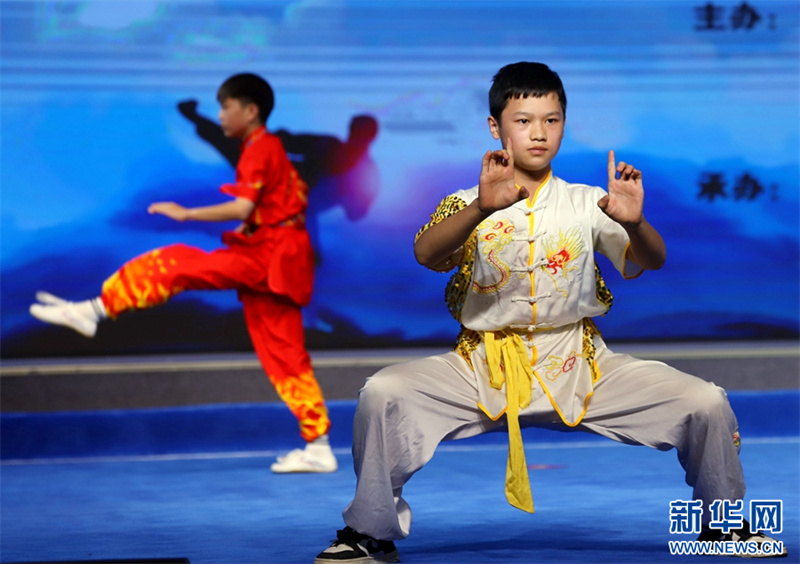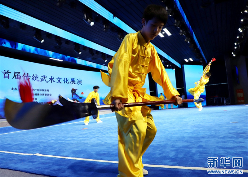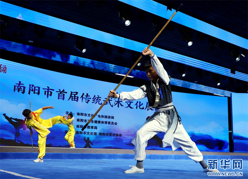 8月28日,河南省南阳市文化馆百姓剧场,参赛选手在进行武术表演。8月28日,河南省南阳市首届传统武术文化展演活动在南阳市文化馆举办。此次展演活动旨在挖掘传统武术精华,弘扬中华武术文化。新华网发(高嵩 摄)