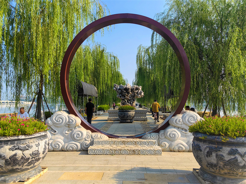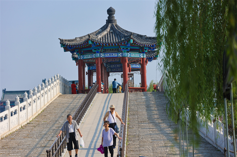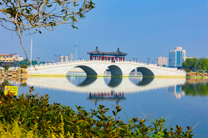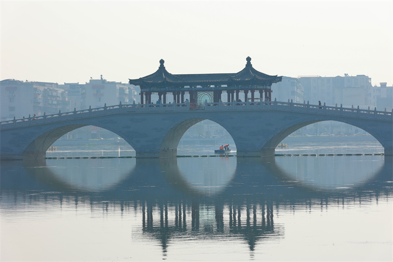 9月4日,开封情人桥倒映在湖面上,与周边的城市景观融为一体,韵味十足,美不胜收,吸引市民、游客前往打卡。开封+记者 石斐 摄