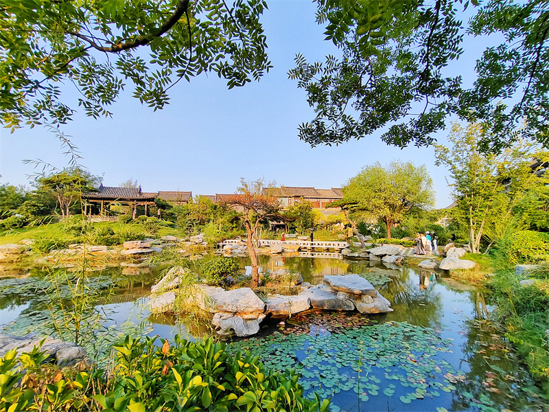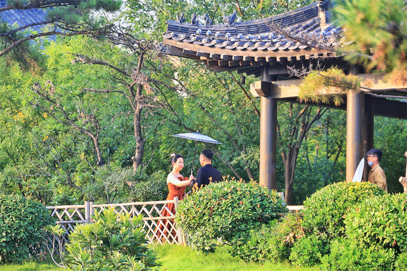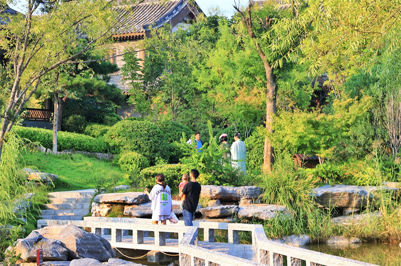 9月4日,游客在半亩园休闲娱乐,拍照游玩,欣赏这里的仿古建筑之美,感受开封古城韵味。开封+记者 李浩 摄
