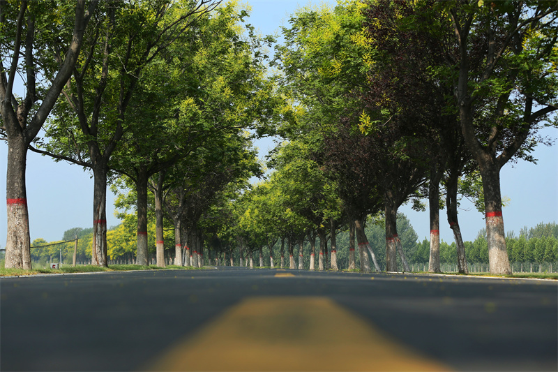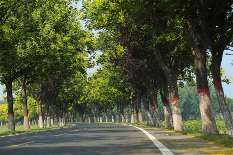 初秋时节的黄河大堤美丽多彩,栾树迎风挺立,成为黄河生态景观一道美丽的风景。开封+记者 袁洋 摄