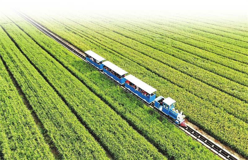 9月9日,汝阳县三屯镇东保村,游客乘坐小火车观赏秋月稻田景色。该村因地制宜发展特色农业种植,走农旅融合发展之路,借助山水田园风光,打造农文旅融合发展综合体,推动农业增效、农民增收。高山岳 李景堂 摄