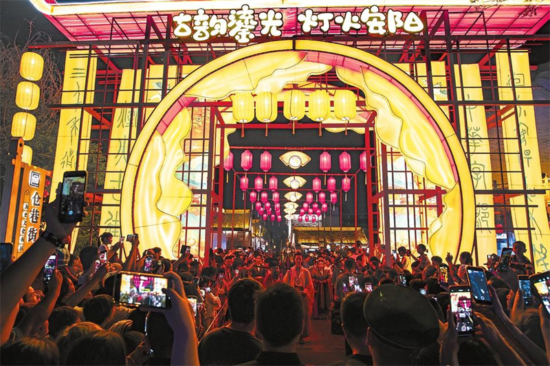 9月7日晚,“古韵鎏光·灯火安阳”大型沉浸式夜游活动在安阳市仓巷街、县前街拉开帷幕。图为游客在仓巷街观光游玩。河南日报社全媒体记者 赵阿娜 摄