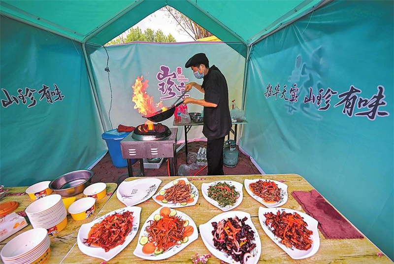9月10日,嵩县举行2023年第二届“伏牛山珍宴”大赛。比赛现场,来自该县16个乡镇20家餐饮企业、民宿酒店、农家乐的厨师们齐秀厨艺、争“香”斗“宴”,将大山里常见的食材烹制成美味佳肴,吸引了众多游客。李卫超 王世光 摄