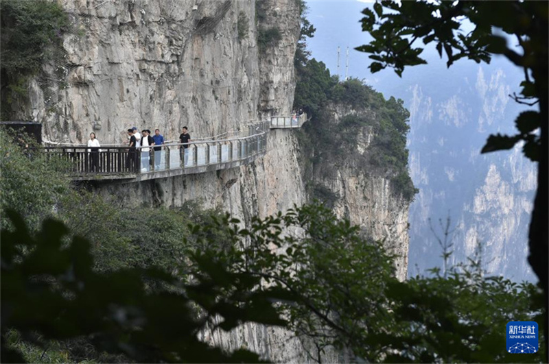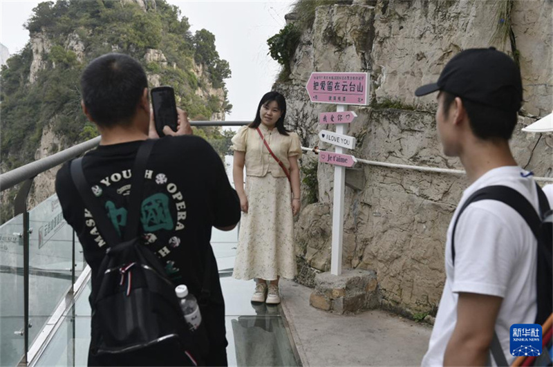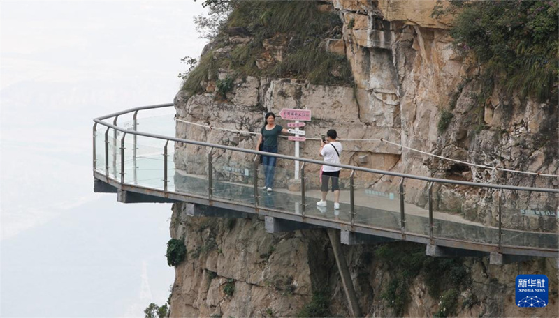 9月17日,游人在云台山景区的玻璃栈道上留影。新华社记者 鲁鹏 摄