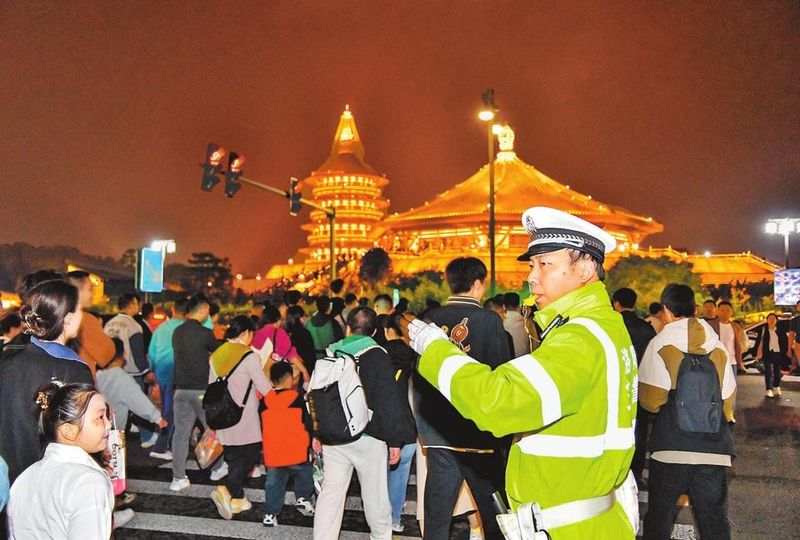 10月3日,洛阳市公安局交警支队民警正在疏导交通。洛阳市公安局交警支队根据假期群众出行特点和交通流量变化,加大警力投入,全力保障群众假期出行安全顺畅。李卫超 郭红胜 摄