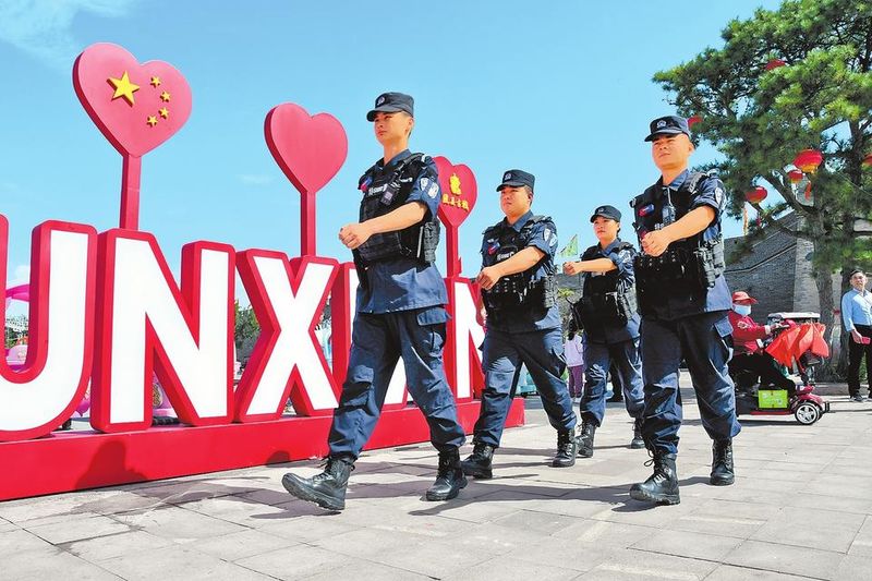 10月2日,民辅警正在浚县古城景区执勤巡逻,为游客群众提供服务。蒋玉河 摄