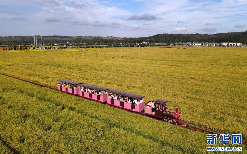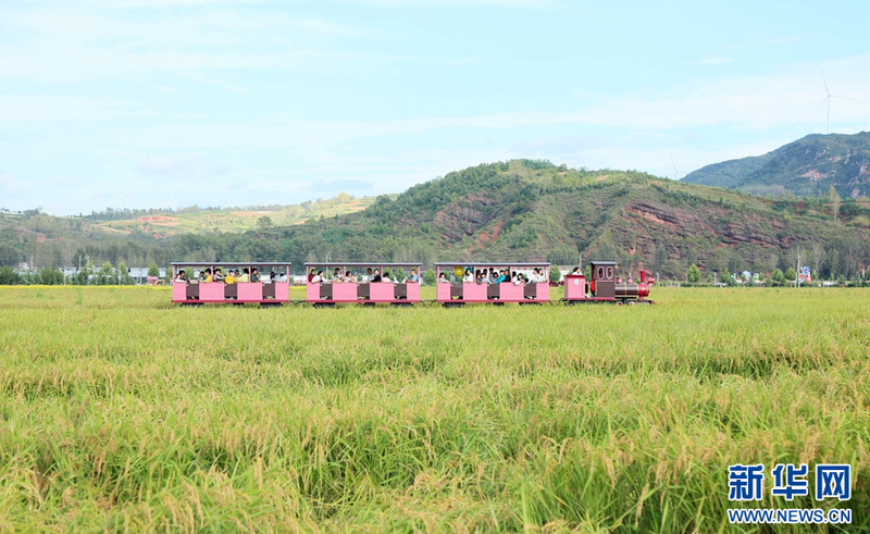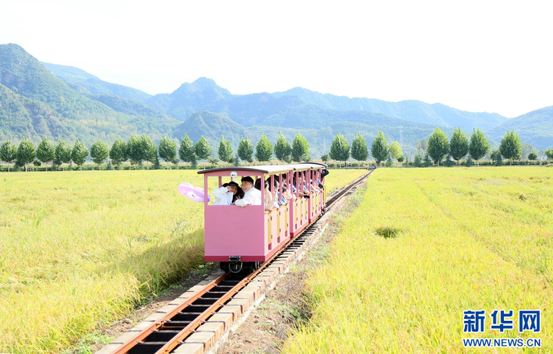 9月29日,游客在河南省洛阳市汝阳县三屯镇东保村稻田坐小火车兴致勃勃地观赏稻田。