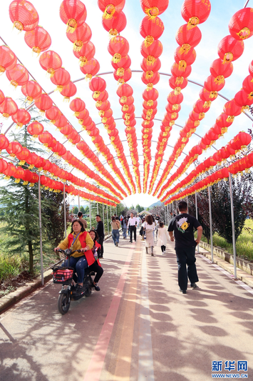 9月29日,在河南省洛阳市汝阳县第三届“独稻三屯”稻田音乐节上,大红灯笼高高挂起,游人如织,热闹异常。