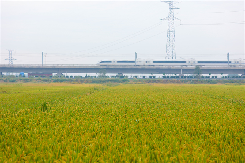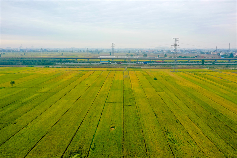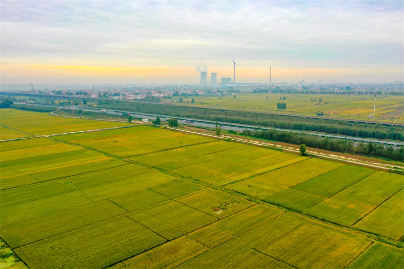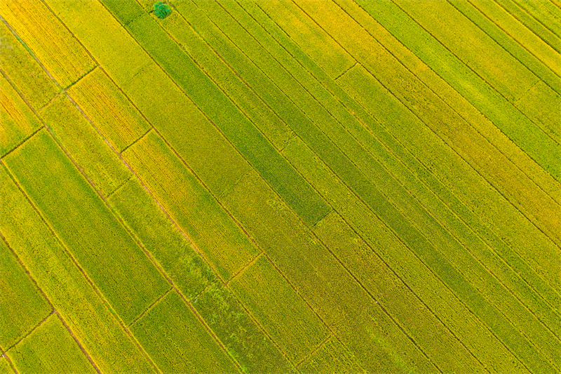 10月7日,顺河回族区东郊乡道士房村稻穗飘香,美如画卷,从空中俯瞰,田野阡陌纵横,一派丰收景象。开封+记者 石斐 摄