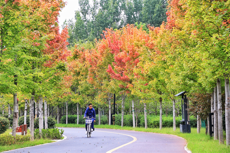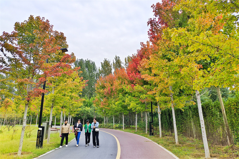 近日,开封市秋意渐浓,沿黄生态廊道的枫叶逐渐变红,吸引市民和游客前来欣赏醉人美景。开封+记者 李浩 摄