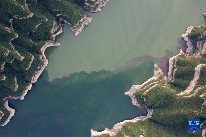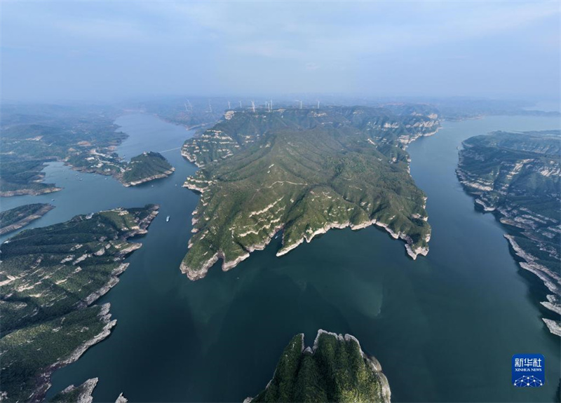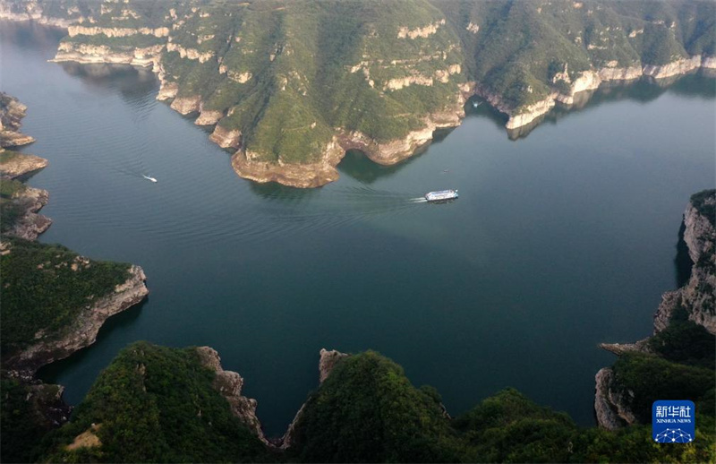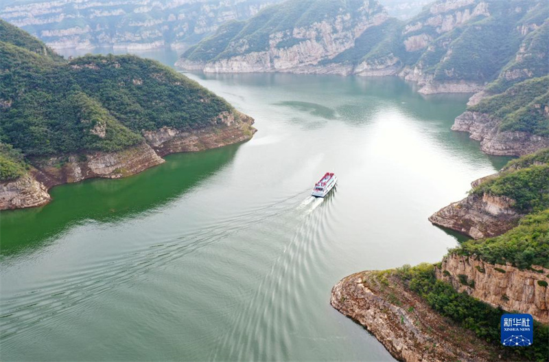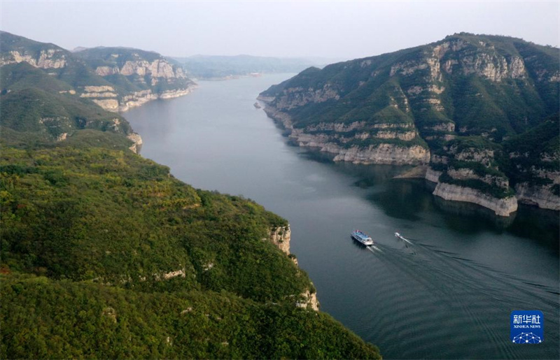 这是10月8日拍摄的河南济源黄河三峡景色(无人机照片)。时值秋日,位于小浪底水利枢纽上游的河南济源黄河三峡景区,奇峰峻秀,碧波荡漾,构成一幅秀美壮丽的山水画卷。新华社记者 邢广利 摄