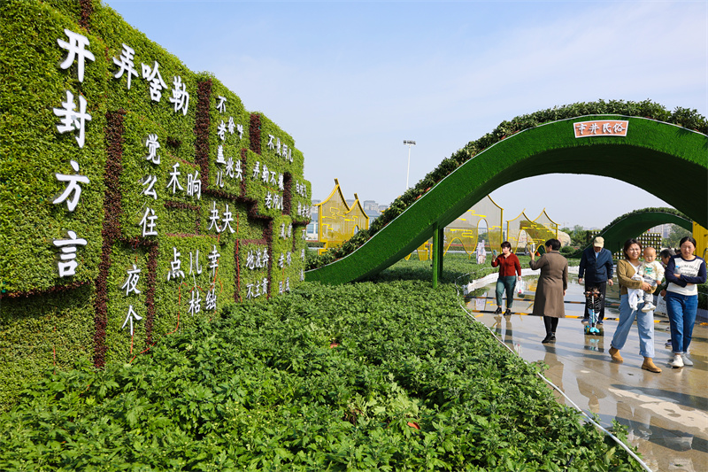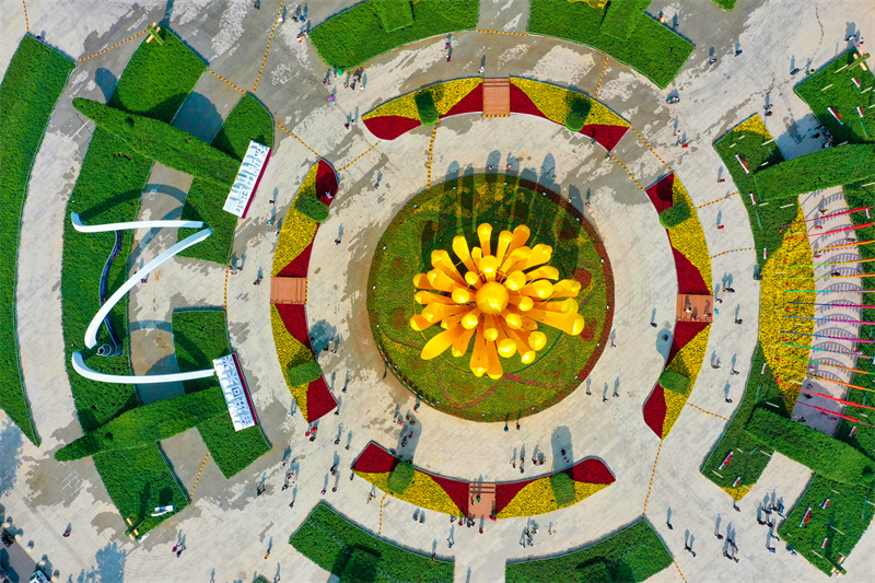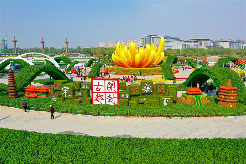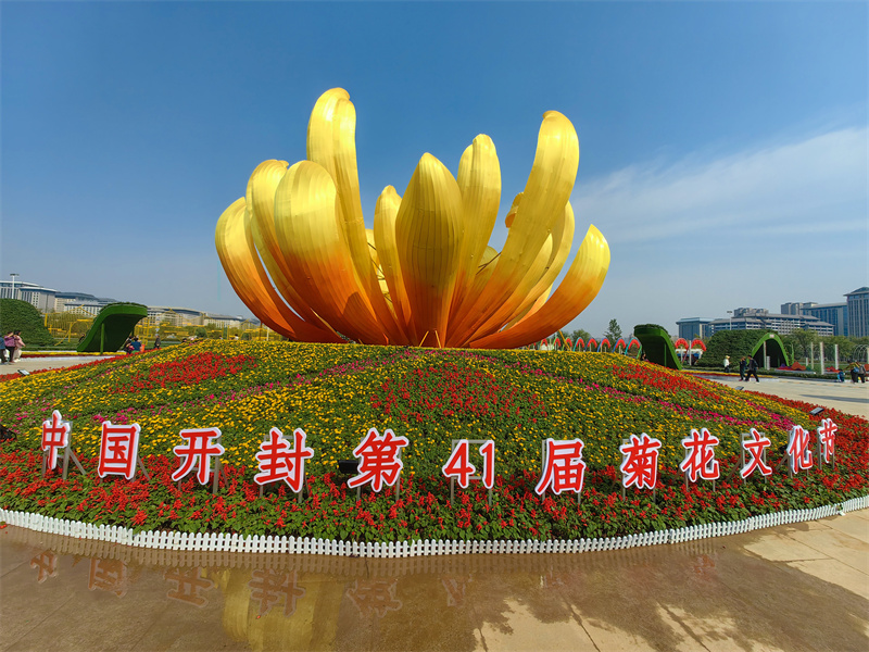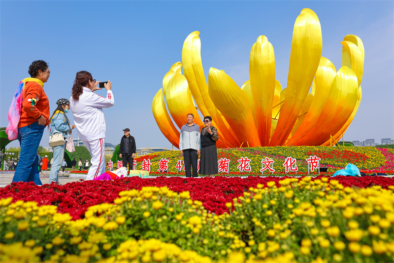 10月11日,开封市民广场上菊花造型精美别致,吸引不少市民、游客前来打卡。开封+记者 石斐 摄