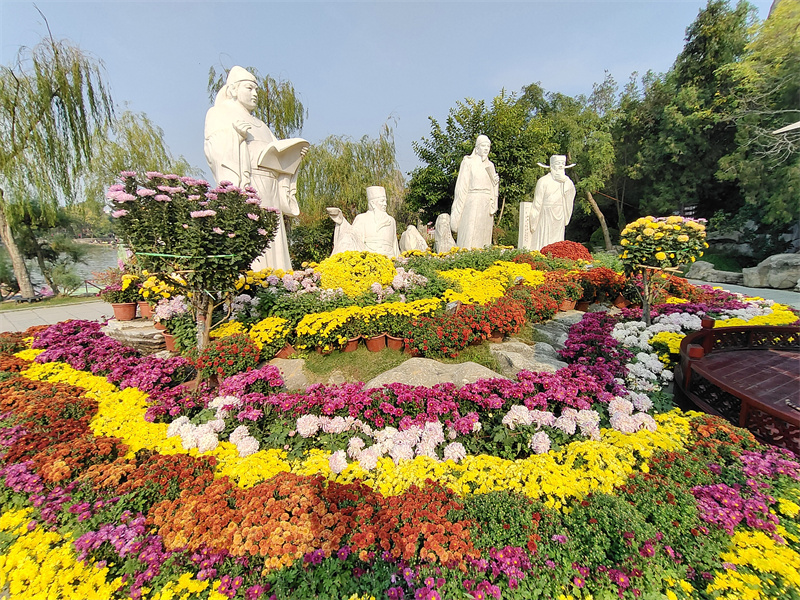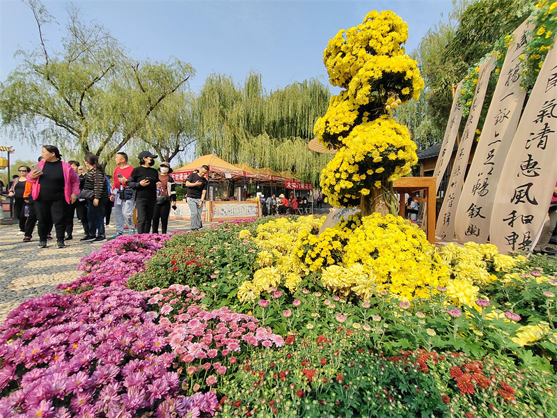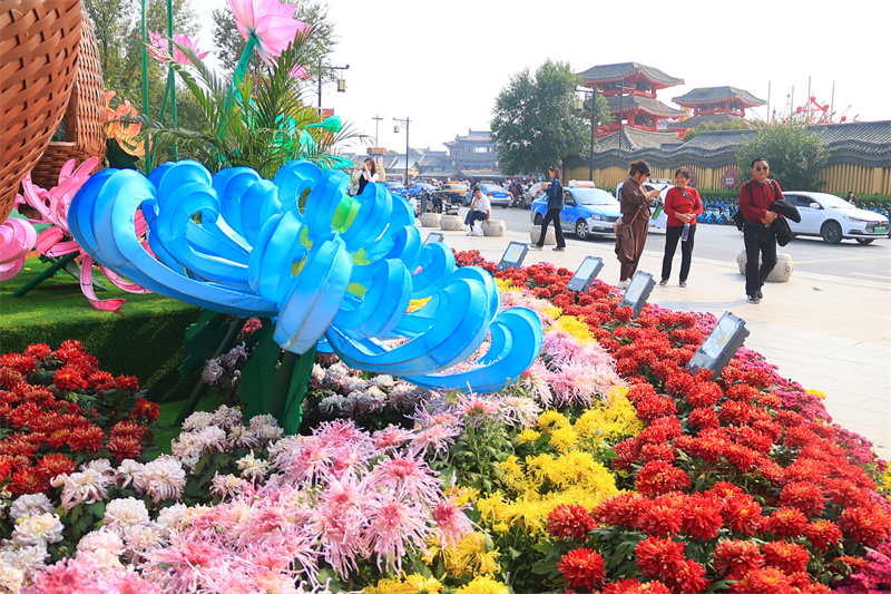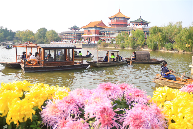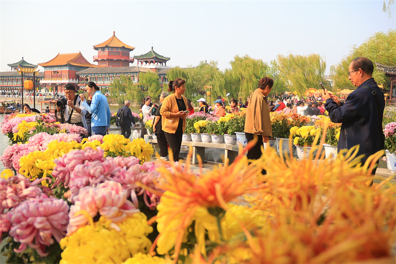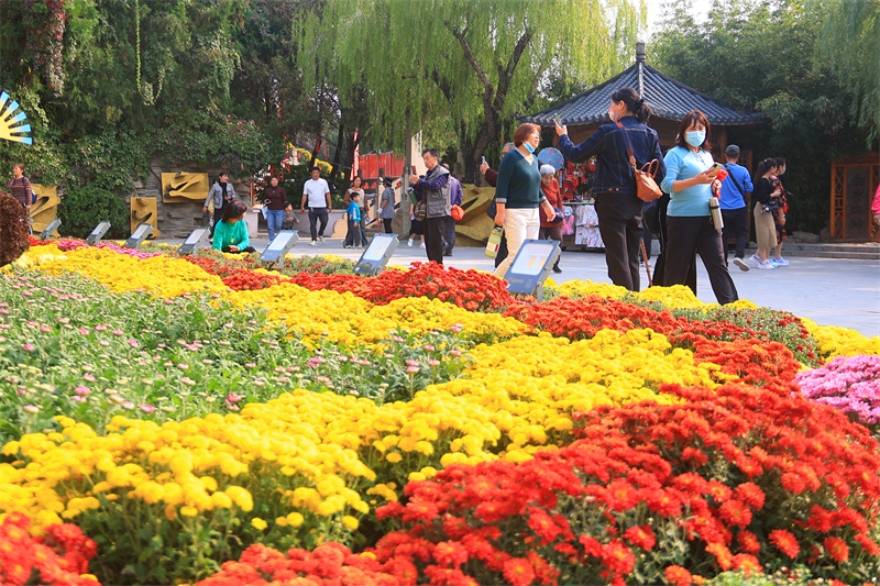 10月13日,在中国翰园碑林景区,游客畅游在菊花“花海”中,欣赏古城美景。开封+记者李浩 摄