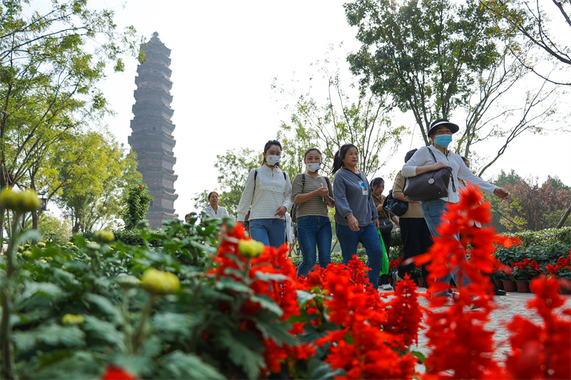 10月16日,随着中国开封第41节菊花文化节即将到来,开封市街头、公园处处洋溢着节日气氛,游客踏秋赏菊,畅游古城。开封+记者 石斐 摄