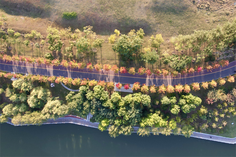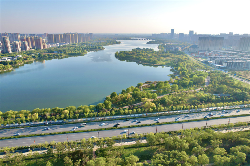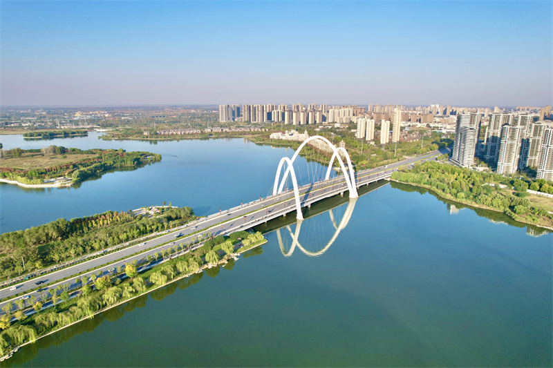 秋日的阳光照射在水面、彩虹桥、树木上,散发出迷人的光影魅力,构成一幅幅美丽的古城秋日画卷。开封+记者 姜菡 10月20日摄