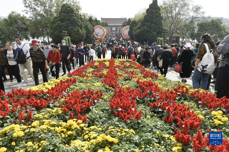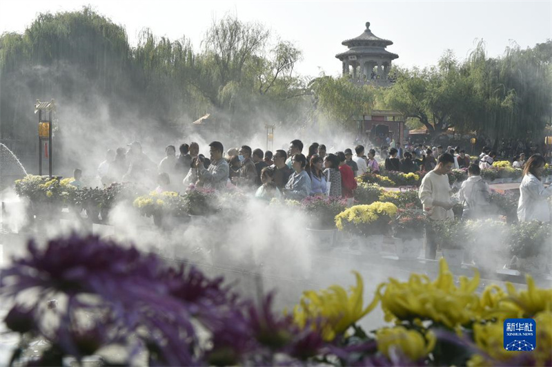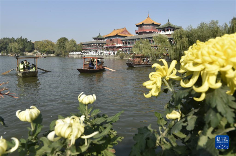 游人在开封市龙亭公园游园(10月23日摄)。近日,中国开封第41届菊花文化节正在河南省开封市举行。本届菊花文化节为期一个月,以“宋韵开封·菊香中国”为主题,在市内多个景区共布展菊花320万盆,为游客带来一场既有时代气息又具开封特色的菊花文化盛宴。新华社记者 鲁鹏 摄