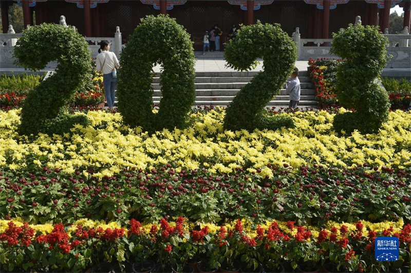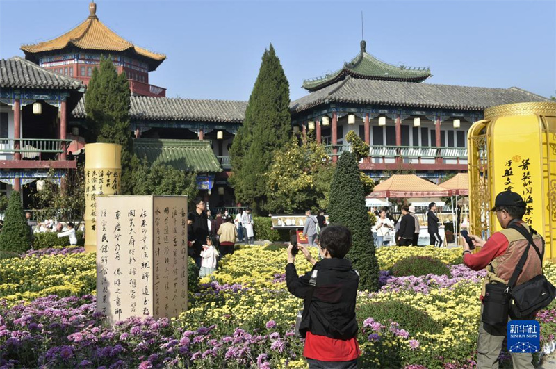 10月29日,游人在开封市中国翰园碑林景区游园赏花。近日,中国开封第41届菊花文化节正在河南省开封市举行。本届菊花文化节为期一个月,以“宋韵开封·菊香中国”为主题,在市内多个景区共布展菊花320万盆,为游客带来一场既有时代气息又具开封特色的菊花文化盛宴。 新华社记者 鲁鹏 摄