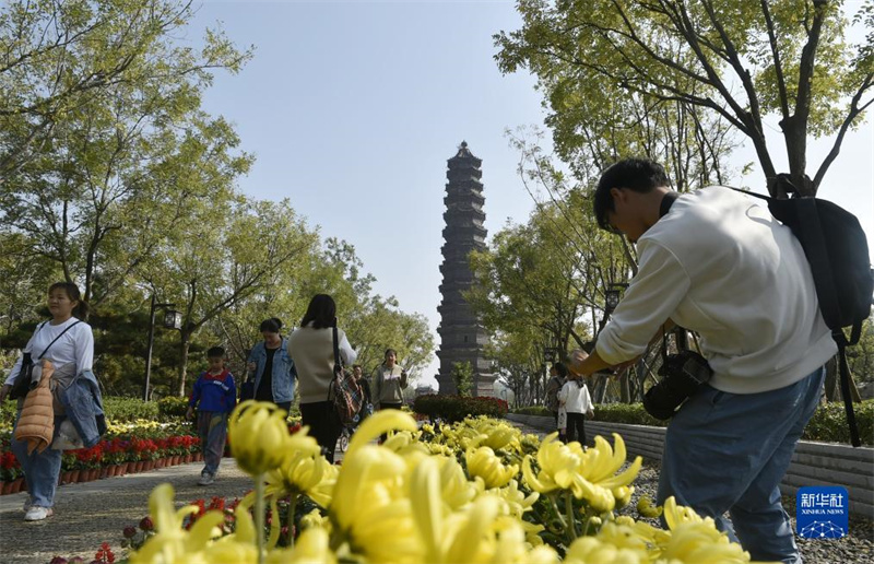 10月29日,游人在开封市铁塔公园游园赏花。近日,中国开封第41届菊花文化节正在河南省开封市举行。本届菊花文化节为期一个月,以“宋韵开封·菊香中国”为主题,在市内多个景区共布展菊花320万盆,为游客带来一场既有时代气息又具开封特色的菊花文化盛宴。新华社记者 鲁鹏 摄