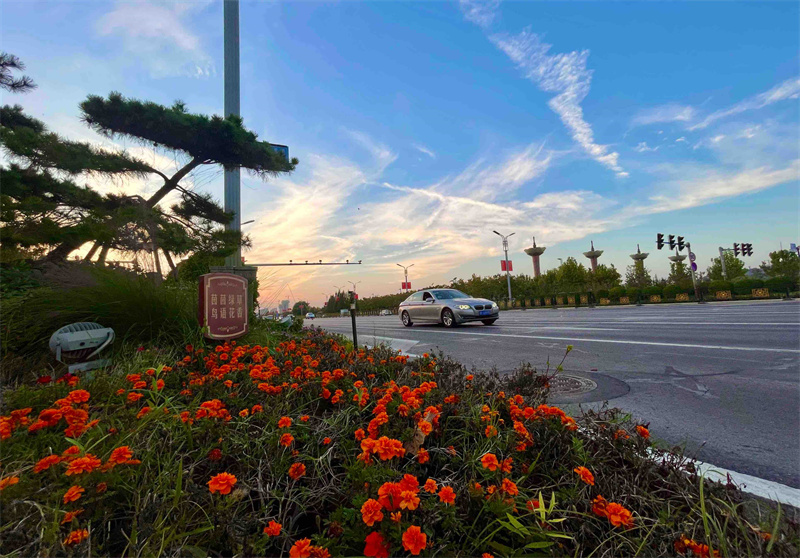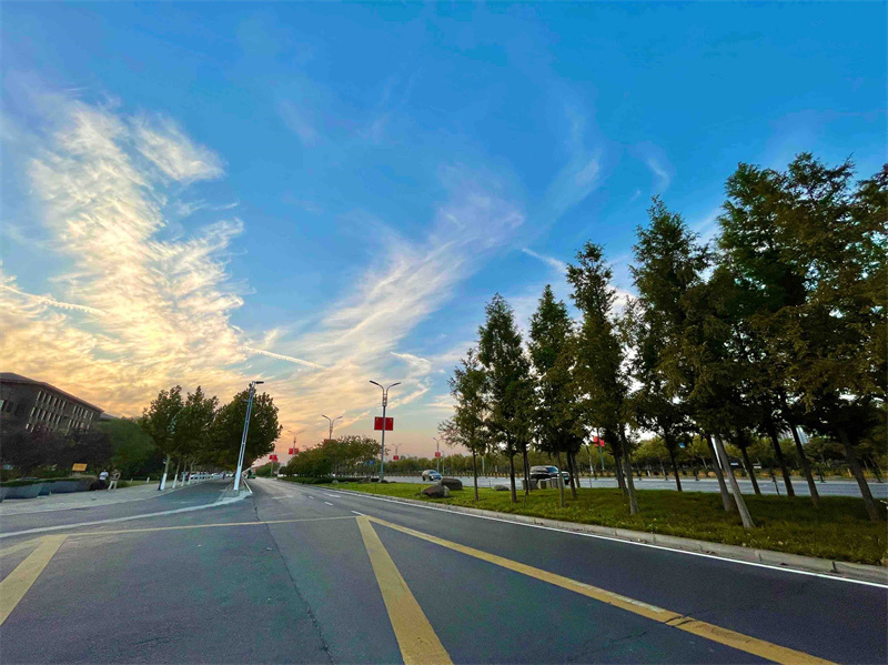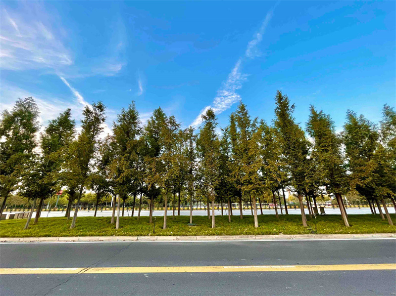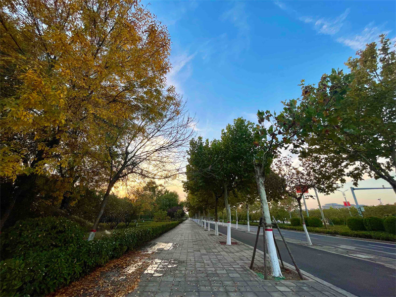 10月31日,郑开大道秋意正浓,色彩斑斓的树木与蓝天白云同框,景色迷人。开封+记者 姜菡 摄