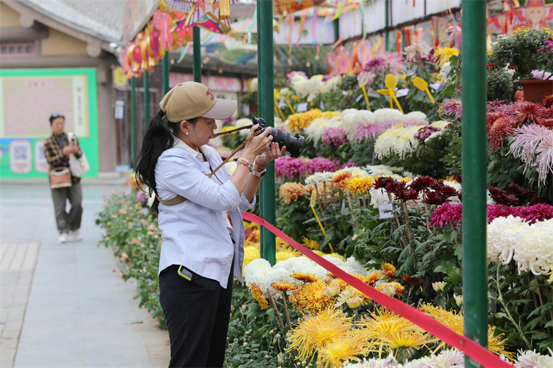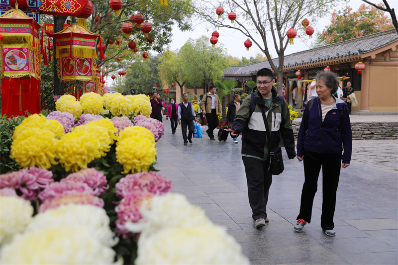 11月3日,游客在赏菊游玩。眼下,开封市公园景点、街头广场菊花盛开,满城菊香,吸引众多游客前来赏菊游玩、拍照留念。开封+记者 姜菡 摄