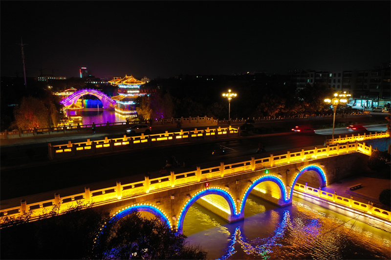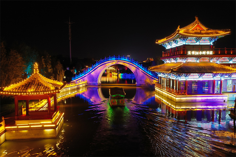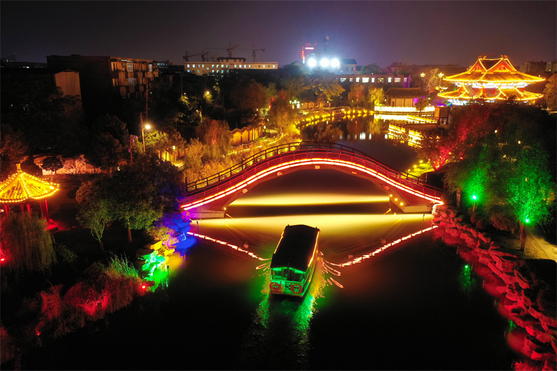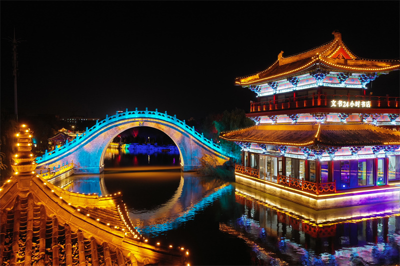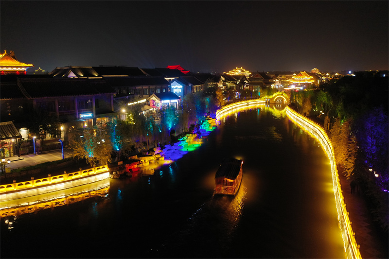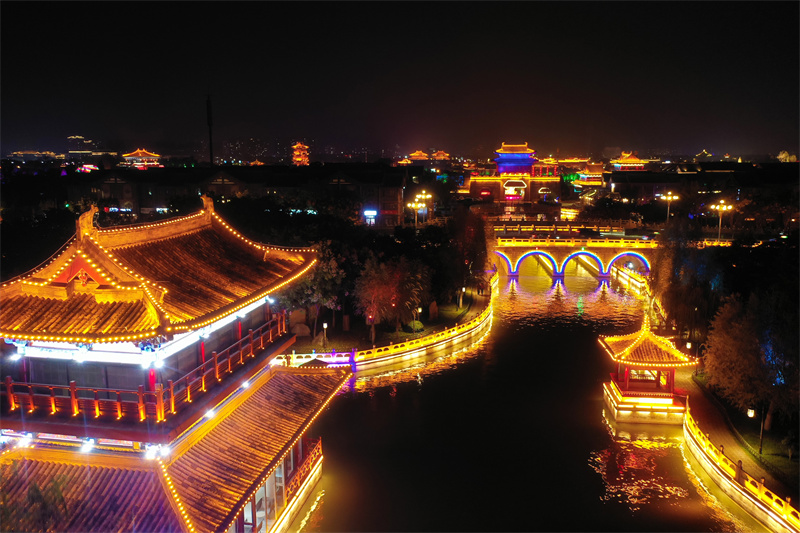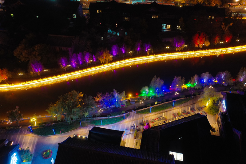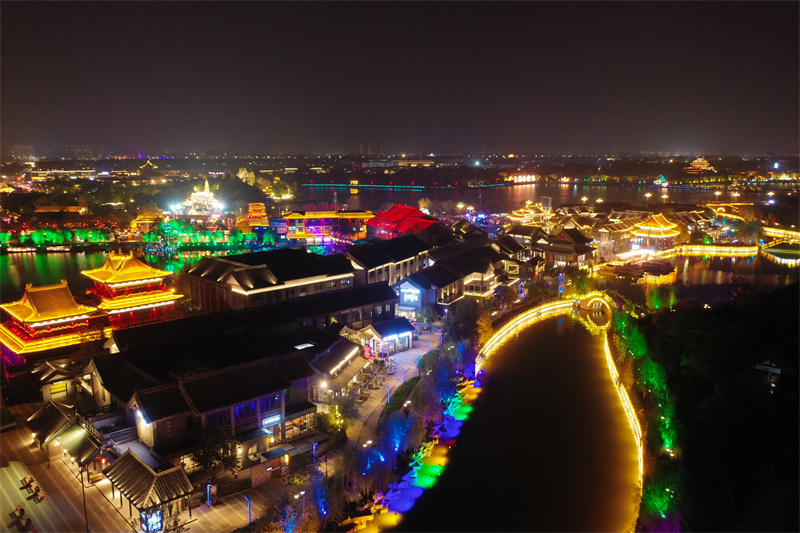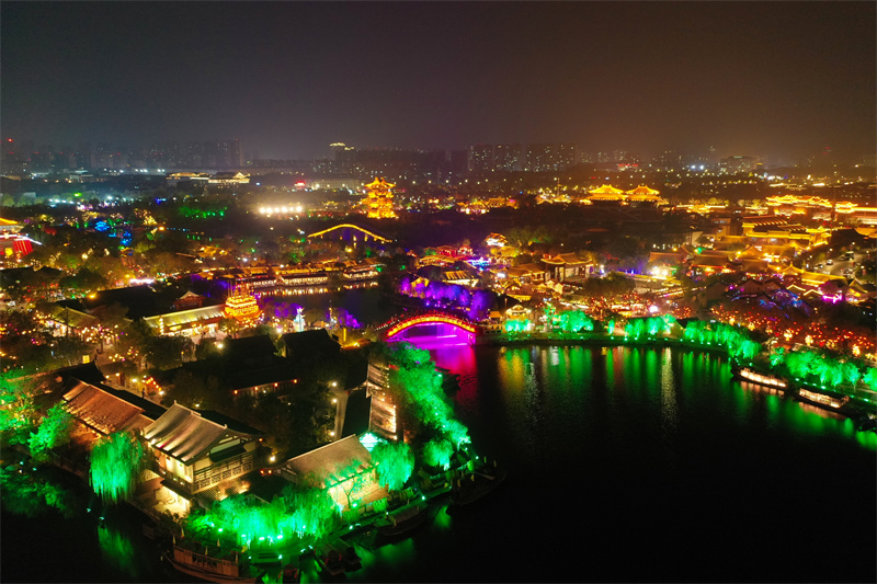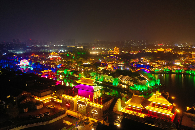 11月7日,夜幕降临后,开封市古色古香的建筑与流光溢彩的灯光交相辉映,展现出独特魅力。开封+记者 石斐 摄