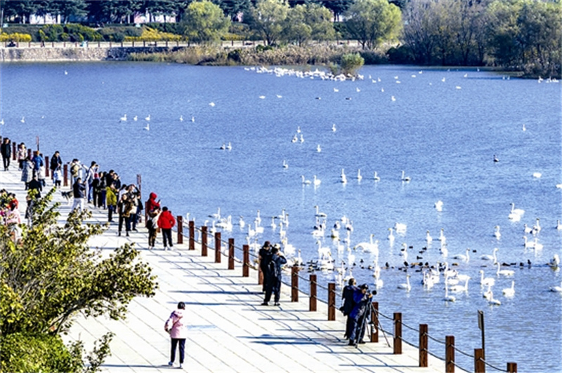 11月14日,在初冬的阳光下,三门峡天鹅湖国家城市湿地公园展现出宁静而美丽的景色,大批从西伯利亚南迁来此栖息越冬的白天鹅吸引了大批游客。在这里,白天鹅自由自在地在湖中嬉戏,优雅地挥动着翅膀,如同一群舞者在湖面上翩翩起舞,游客们纷纷拿出相机,捕捉美妙的瞬间。 三门峡日报 记者 杜杰 摄