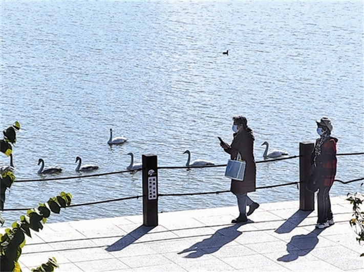 11月25日,在三门峡天鹅湖国家城市湿地公园,两名游人漫步湖边,欣赏天鹅优美的身姿。碧波荡漾的湖面上,天鹅时而优雅地休憩游弋,时而振翅引吭,成为天鹅湖一道亮丽的风景线。 三门峡日报记者 李秀芝 摄