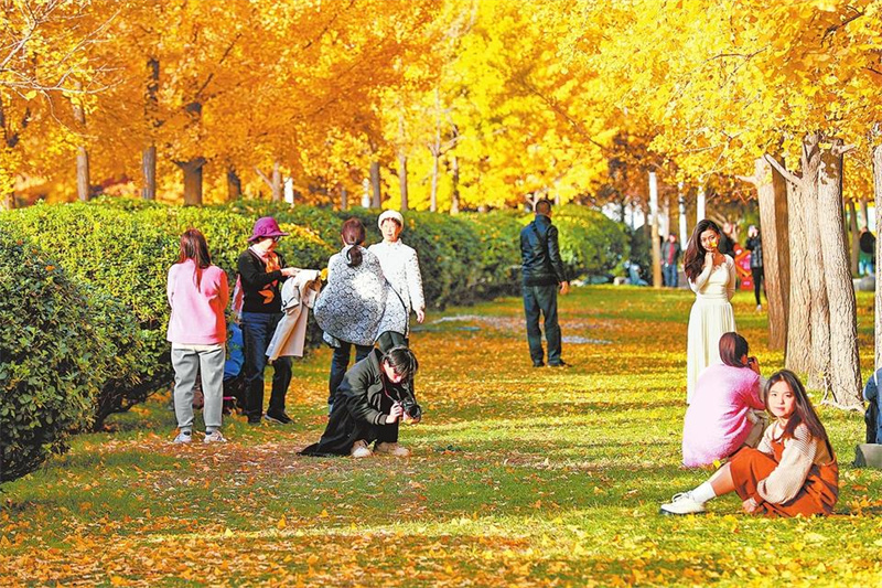 市民在银杏树下观赏、游玩