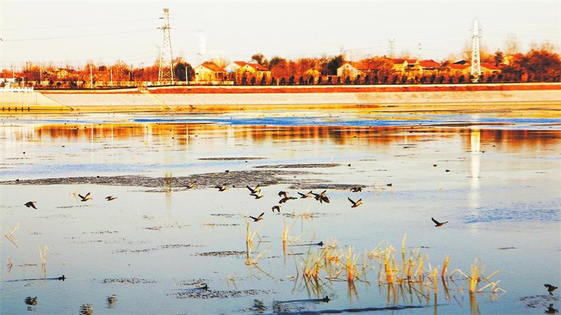 12月2日,夕阳映照下的柘城县七里桥水库库区,一群群水鸟在此飞翔、觅食,呈现出一幅美丽和谐的生态画面。张子斌 摄