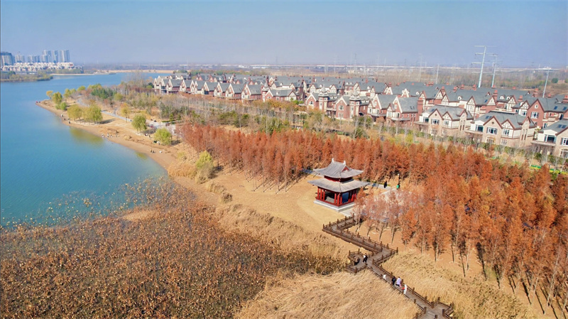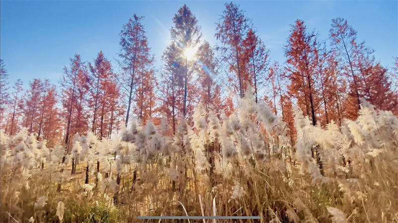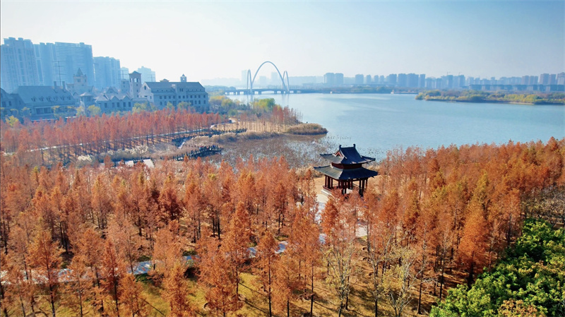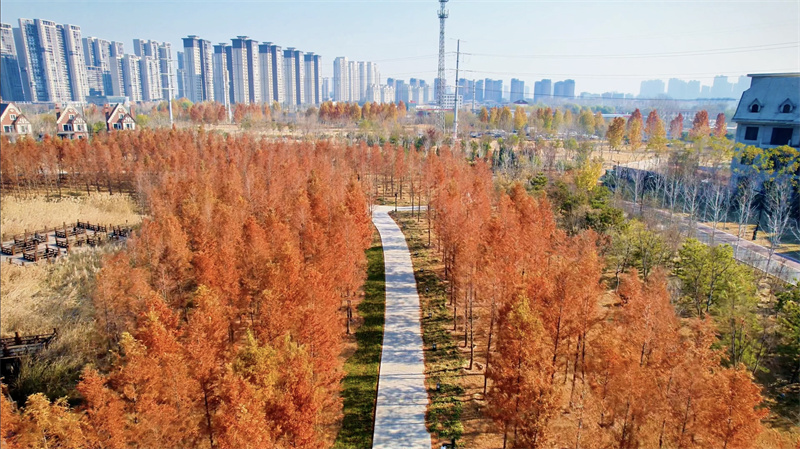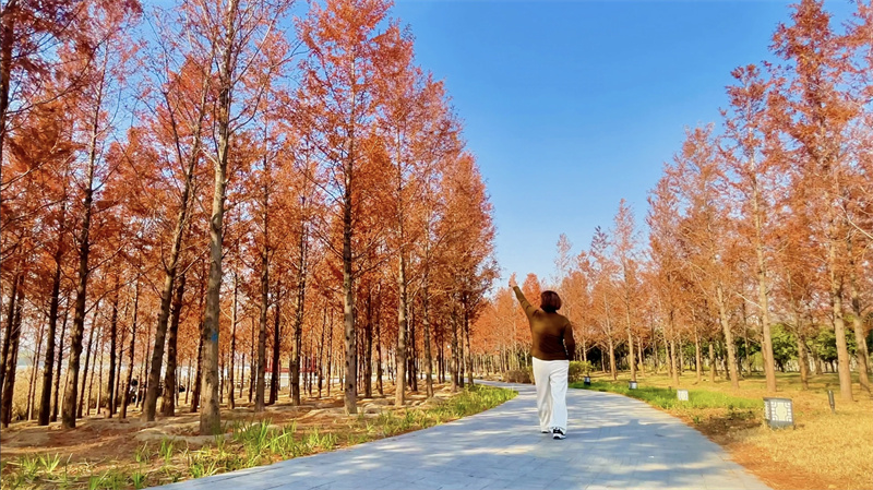 近日,黑岗口调蓄水库附近成片水杉树叶变红,色彩艳丽,风景如画,吸引不少市民前来打卡。开封+记者 姜菡 12月4日 摄