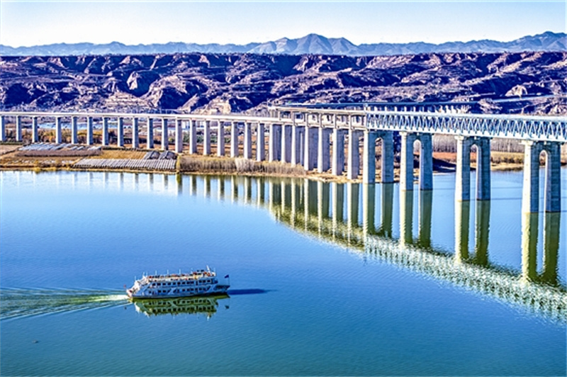 12月6日,黄河陕州区段,一艘游船正行驶。水面如镜,桥影倒映,远山如黛,宛如一幅优美的风景画。中国三门峡网 - 三门峡日报记者 杜杰 摄
