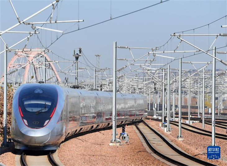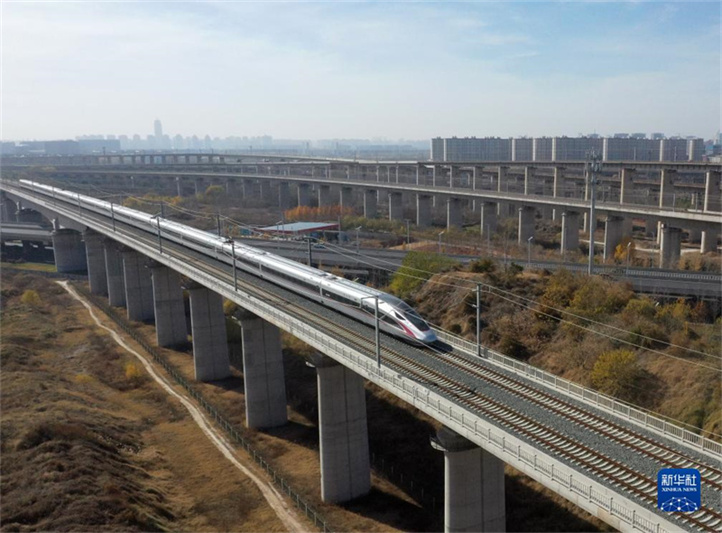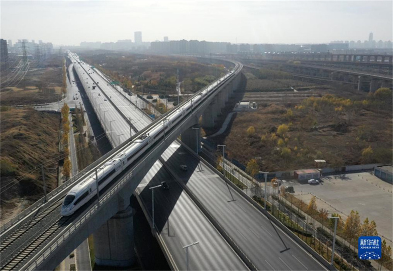 12月8日,在郑州市东三环附近,列车行驶在济郑高速铁路上(无人机照片)。12月8日,济郑高铁全线贯通运营。济郑高铁是国家“八纵八横”高铁网的重要连接线,是山东省“八纵六横”高铁网的西向出省通道,也是河南“米”字形高铁网的最后一“笔”。项目通车后,鲁豫两省实现高铁直通,郑州东站至济南西站间最快1小时43分钟可达。新华社记者 李嘉南 摄