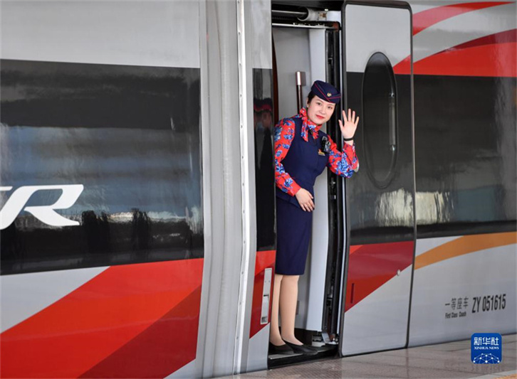 12月8日,济郑高铁郑州东站首发G4830次列车乘务员向旅客挥手致意。12月8日,济郑高铁全线贯通运营。济郑高铁是国家“八纵八横”高铁网的重要连接线,是山东省“八纵六横”高铁网的西向出省通道,也是河南“米”字形高铁网的最后一“笔”。项目通车后,鲁豫两省实现高铁直通,郑州东站至济南西站间最快1小时43分钟可达。新华社记者 李嘉南 摄
