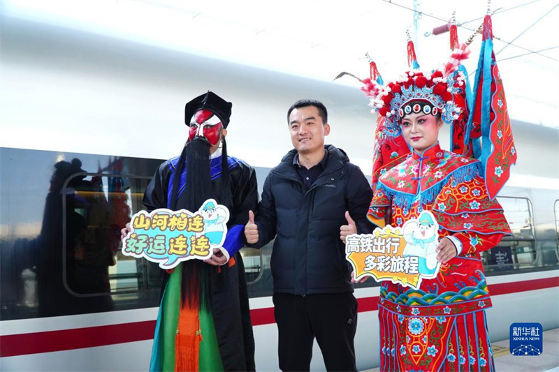 12月8日,在济郑高铁济南长清站,一名乘客与参加济郑高铁全线开通仪式的戏剧演员一起合影。12月8日,济郑高铁全线贯通运营。济郑高铁是国家“八纵八横”高铁网的重要连接线,是山东省“八纵六横”高铁网的西向出省通道,也是河南“米”字形高铁网的最后一“笔”。项目通车后,鲁豫两省实现高铁直通,郑州东站至济南西站间最快1小时43分钟可达。新华社记者 徐速绘 摄
