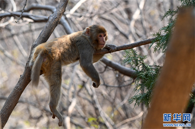 12月9日,河南省沁阳市神农山风景区太行猕猴园,趴在树枝上的猕猴。