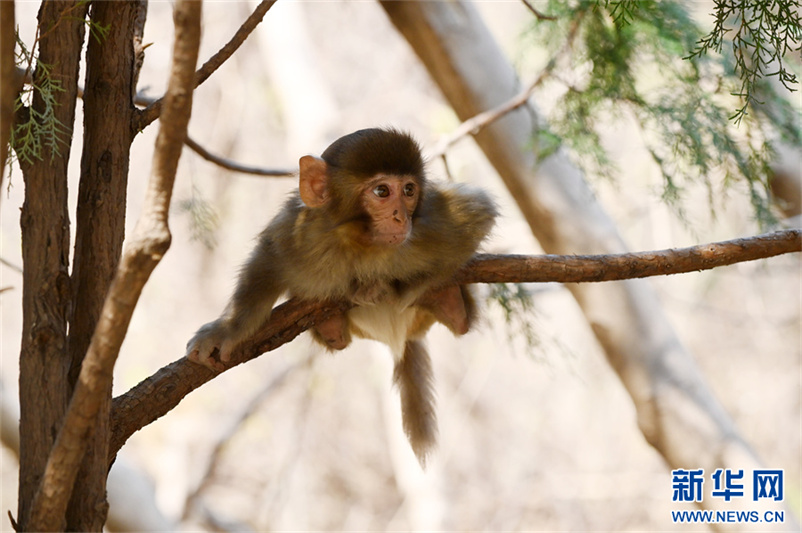 12月9日,河南省沁阳市神农山风景区太行猕猴园,坐在树枝上觅食的猕猴。