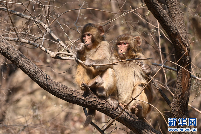 12月9日,在河南省沁阳市神农山风景区太行猕猴园拍摄的两只猕猴。大雪时节,河南省沁阳市神农山风景区太行猕猴园内,成群的猕猴或在地上觅食,或在树枝间跳跃,或相互依偎取暖,惹人喜爱。新华网发(杨帆 摄)
