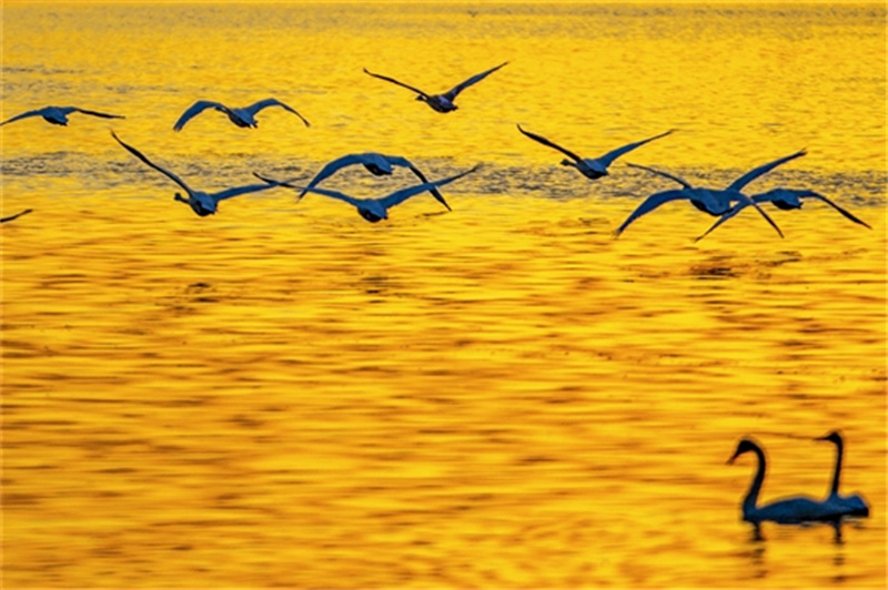 近日,三门峡天鹅湖国家城市湿地公园的湖面被晨光染上一层金色,越冬的白天鹅在水面上起飞,翱翔天空,构成了一幅美丽的画卷。进入12月,来三门峡越冬的白天鹅数量骤然增多,前来观赏的游人也越来越多。 中国三门峡网 - 三门峡日报 记者 杜杰 摄