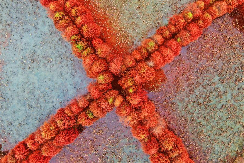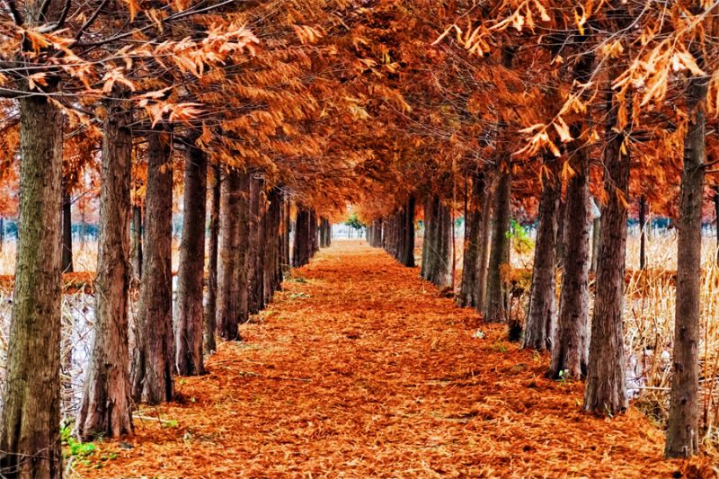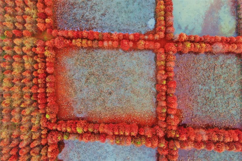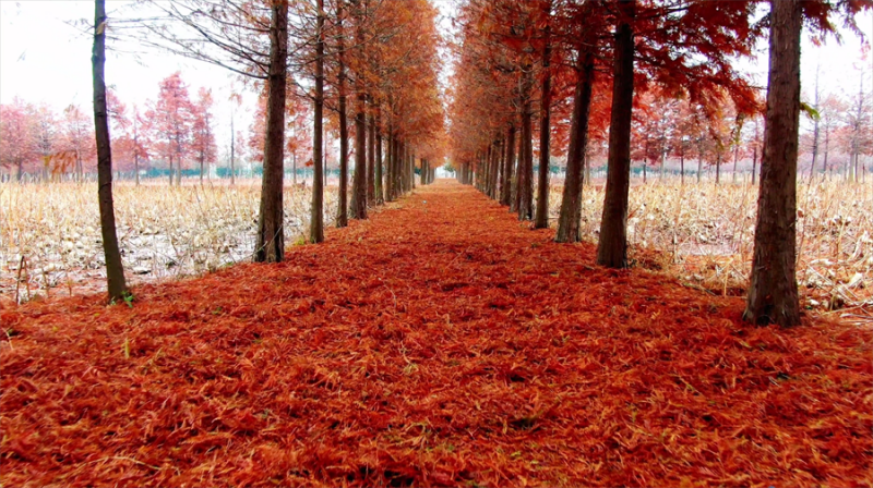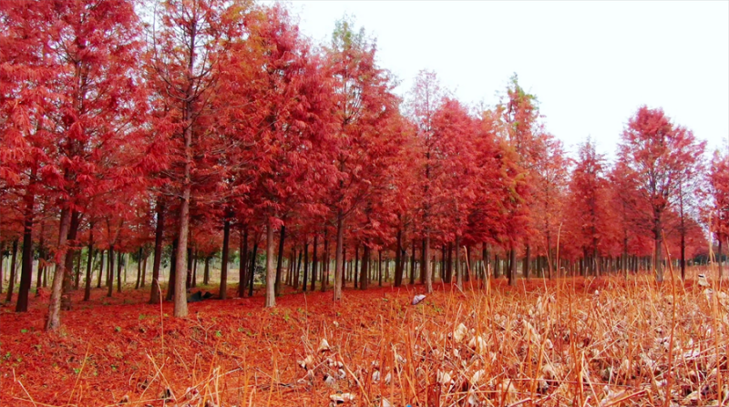 12月13日拍摄的镇平县中原荷花博览园的水杉树。近日,河南省南阳市镇平县中原荷花博览园的水杉树悄然换上“红装”,色彩浓郁,成了冬日一抹别样的风景。(时君洋 摄)