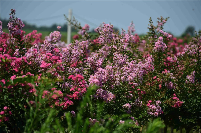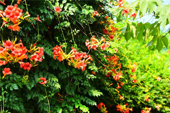 盛夏时节,驻马店市泌阳县铜山湖大道游园里,紫薇花、凌霄花、木槿花、百日菊等各色花儿争相盛开,行走其间如同置身于花海。