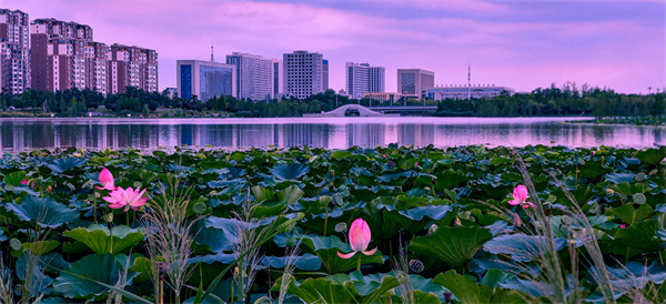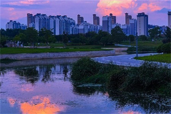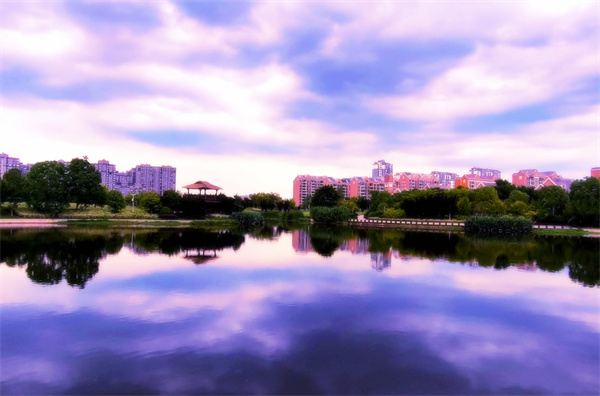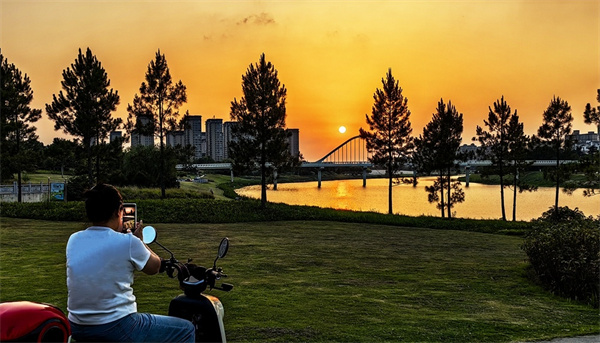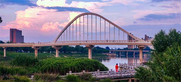 盛夏时节,夕阳西下的驻马店市遂平县汝河公园,落日的余晖洒在宁静的河面上,波光粼粼。晚霞将水、天和大地都染上了华丽的彩色。