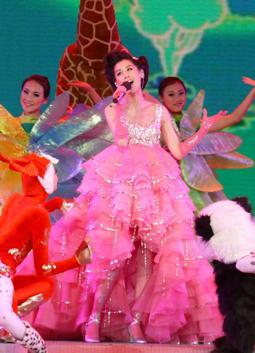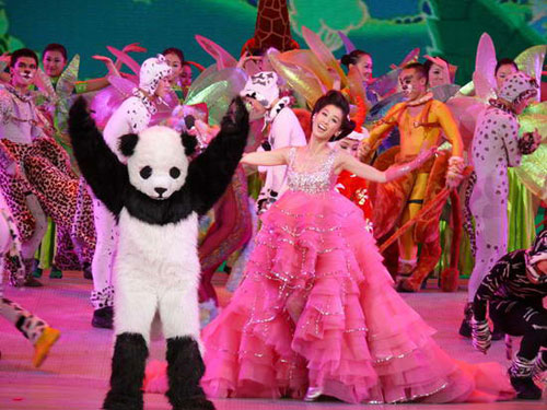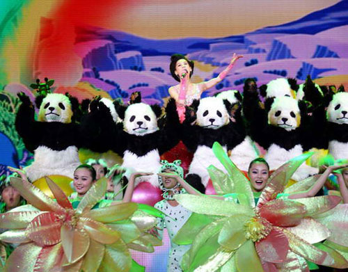 黄圣依春晚化身春姑娘 :大熊猫为化身“春姑娘”的黄圣依伴舞