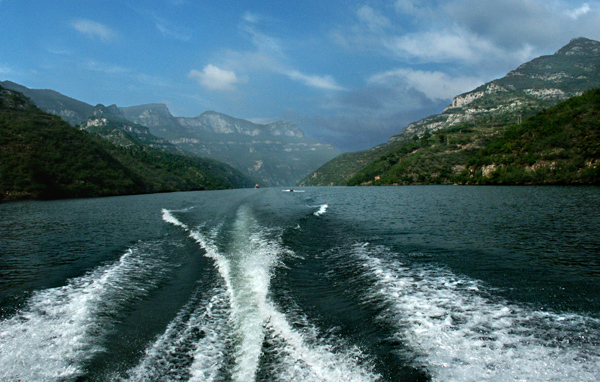 碧水蓝天:两岸山势对峙,湖水清澈涟漪