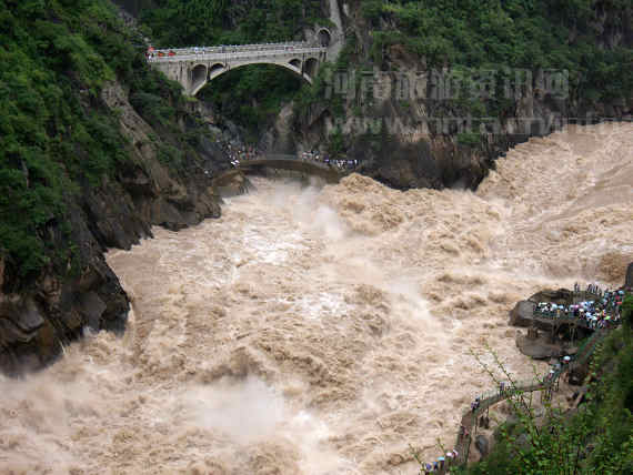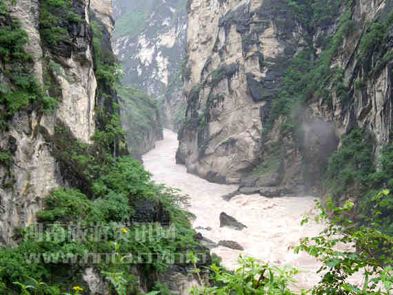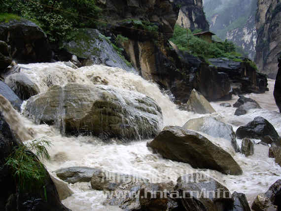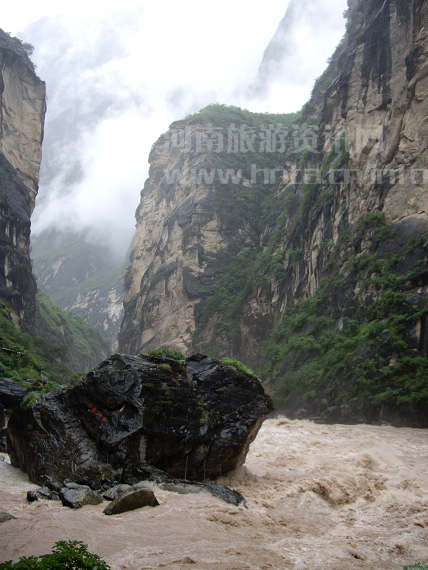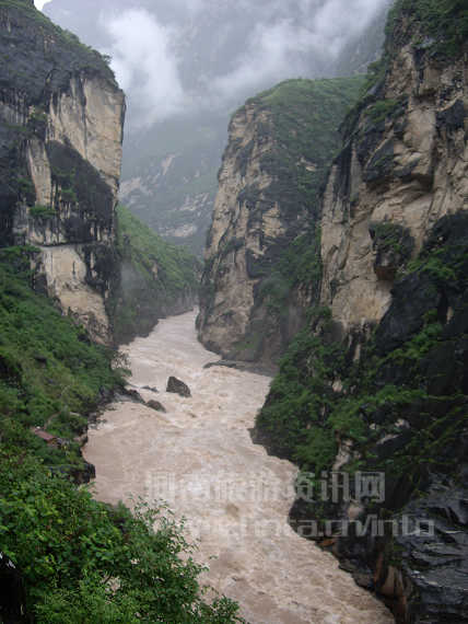 到中虎跳时,雨还是下个不停,冒雨到达谷底,只见黄浊的金沙江江面,激荡的怒涛在礁石间左冲右撞,江面上一片雾氯空蒙。