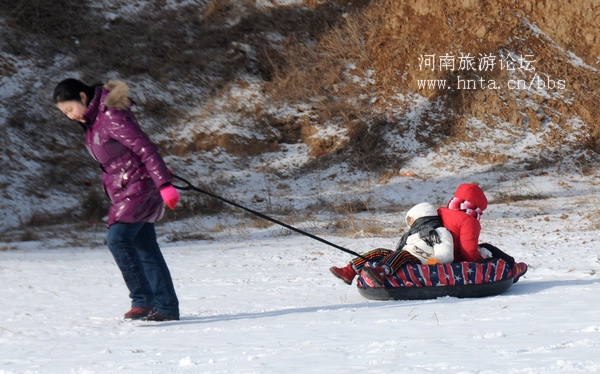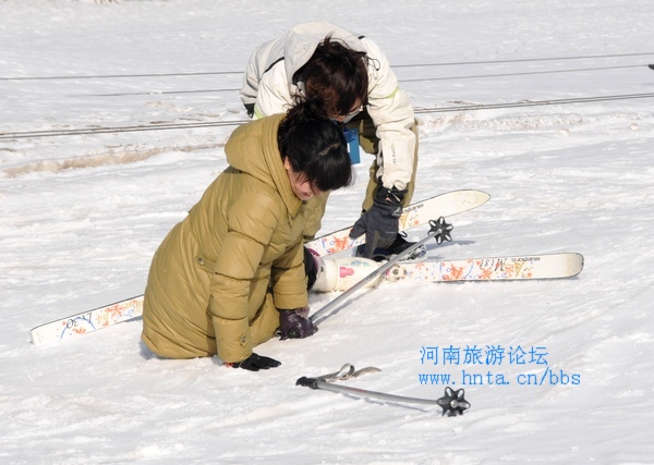 滑雪并不难学,很多人高高兴兴地摔了几跤后,可以从坡上轻松地滑下来。