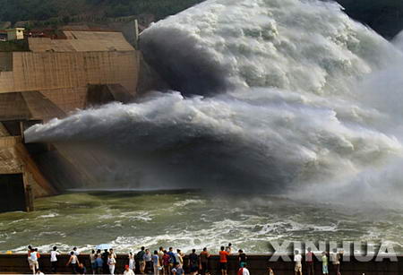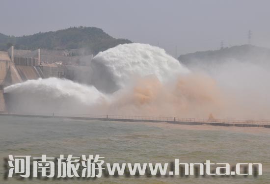 6月19日,2010中国黄河小浪底观瀑节在小浪底风景区开幕。开幕式后小浪底大坝开始开闸放水,只见六条黄白交织的水龙和沙龙从坝板洞中喷涌而出,气势磅礴,惊涛拍岸。