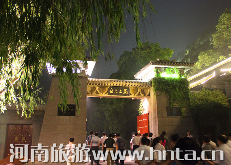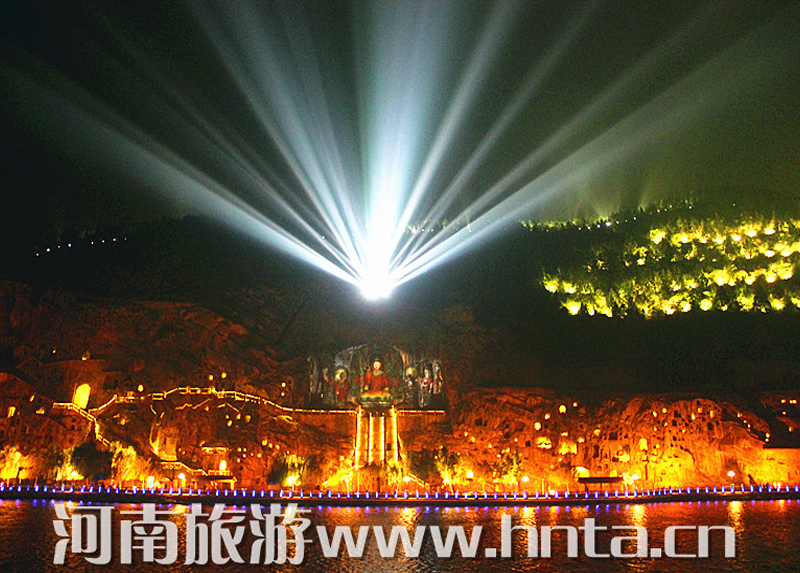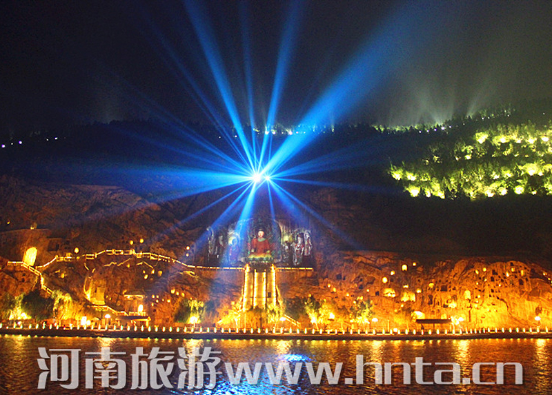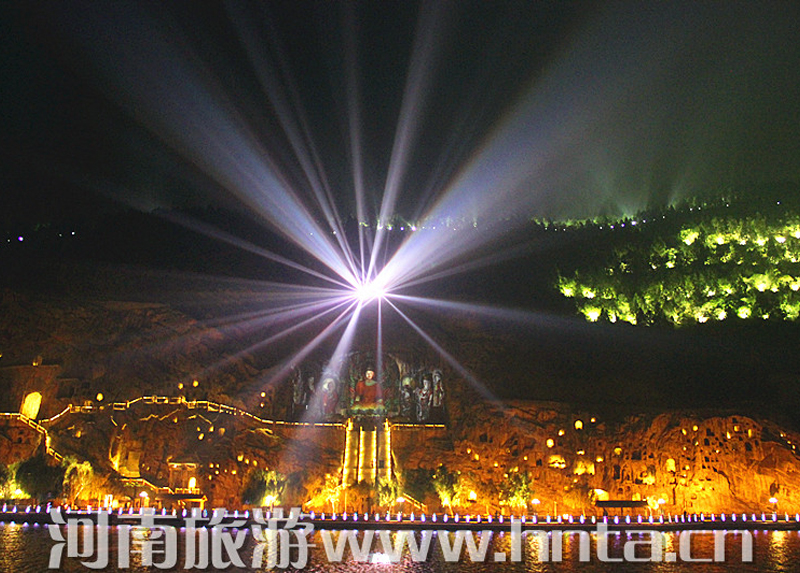 “夜游龙门”从景区停车场开始,各种灯具将景区外的生态停车场、景区商业街和景区绿地照耀得灯火辉煌。进入西山窟区后,宾阳三洞、摩崖三佛、万佛洞、莲花洞等主要洞窟内金碧辉煌。东山礼佛台正前方的水中央,九盏莲花灯玲珑剔透,大者直径达到7米。龙门东山半山腰的香山寺恍如玉宇仙阁。除了灯光艺术外,龙门景区夜游项目还有武皇礼佛、琵琶演奏、古筝表演等活动。图为龙门景区奉先寺。