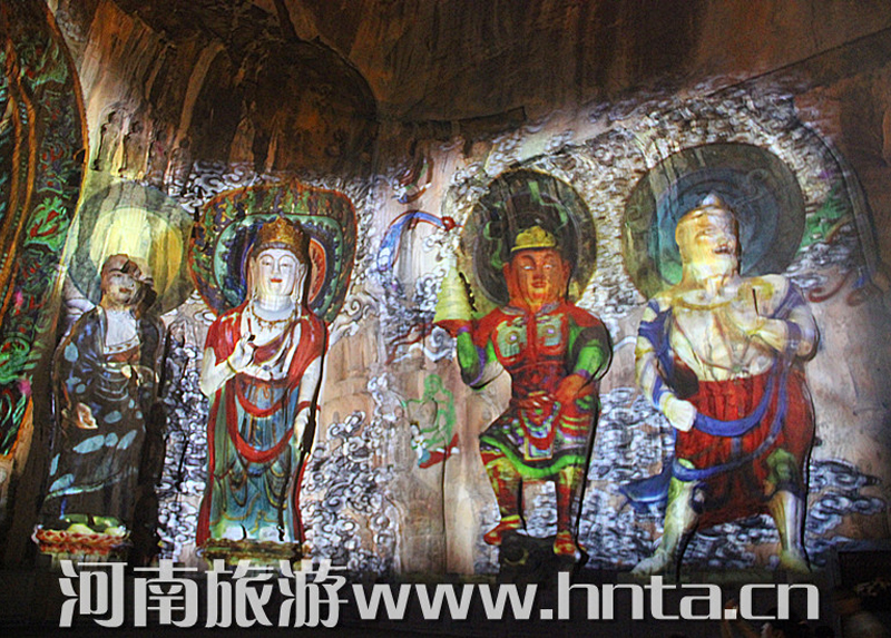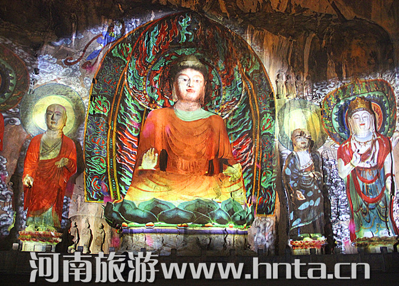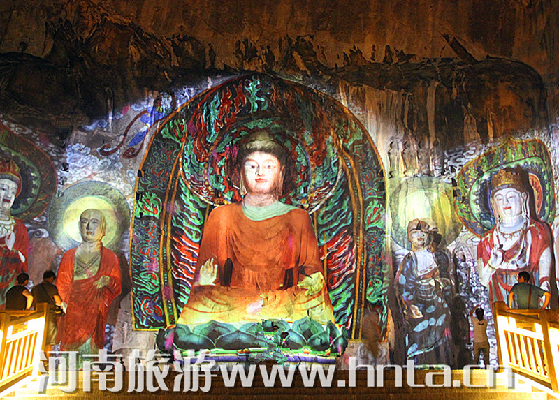 “夜游龙门”从景区停车场开始,各种灯具将景区外的生态停车场、景区商业街和景区绿地照耀得灯火辉煌。进入西山窟区后,宾阳三洞、摩崖三佛、万佛洞、莲花洞等主要洞窟内金碧辉煌。东山礼佛台正前方的水中央,九盏莲花灯玲珑剔透,大者直径达到7米。龙门东山半山腰的香山寺恍如玉宇仙阁。除了灯光艺术外,龙门景区夜游项目还有武皇礼佛、琵琶演奏、古筝表演等活动。图为龙门景区奉先寺卢舍那像龛。