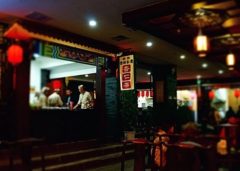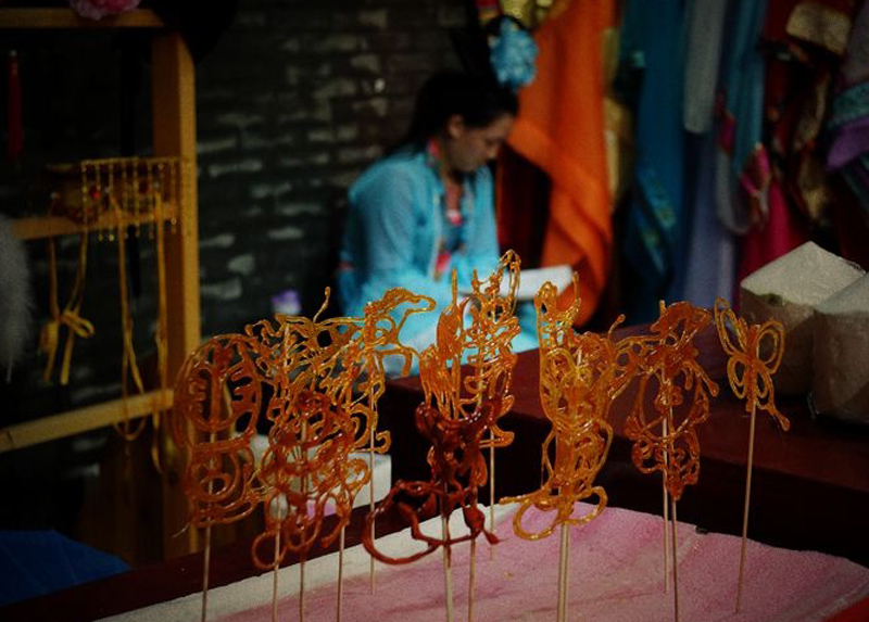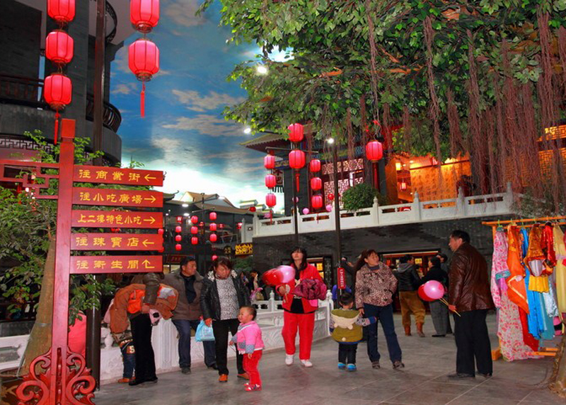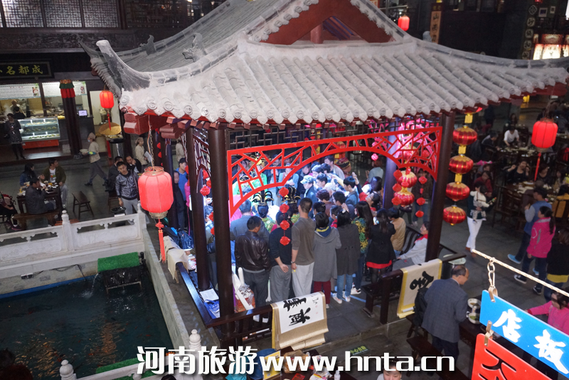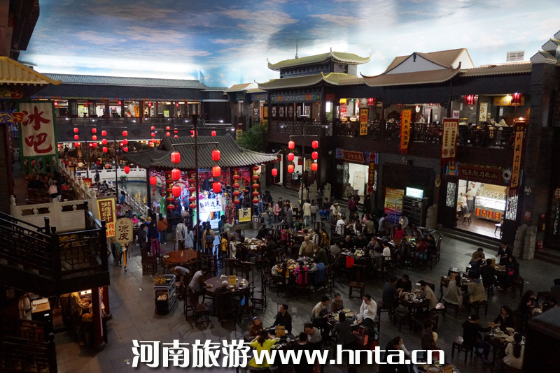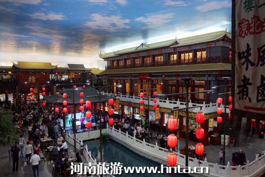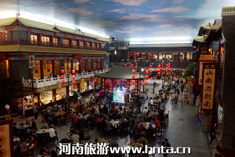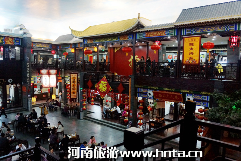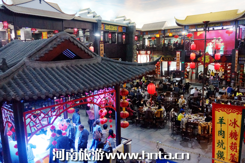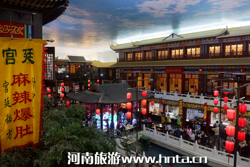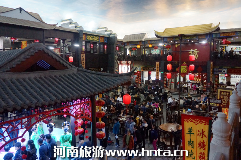 开封小宋城的综合营业区设置在地下一楼,整个营业区内以木质仿古建筑为主,回廊流水,亭台楼榭及戏台上传出的传统戏曲演唱声,仿佛瞬间把人 带回了拙朴又轻缓的北宋时代。抬起头,席天的是喷绘的蓝天白云。加上周围小吃摊贩身上的古装,制作木板年画的老师傅纵横的皱纹,以及路边一排绣娘手中的银 针,让来者一时忘忧。